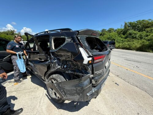 PLAYA DEL CARMEN, Quintana Roo, 08 de octubre de 2025.– Una mujer resultó lesionada luego de que el vehículo en el que viajaba fuera impactado por una camioneta de transporte turístico en la carretera federal 307, a la altura del hotel Dorado Seaside, cuando su conductora intentó tomar un retorno sin la debida precaución.