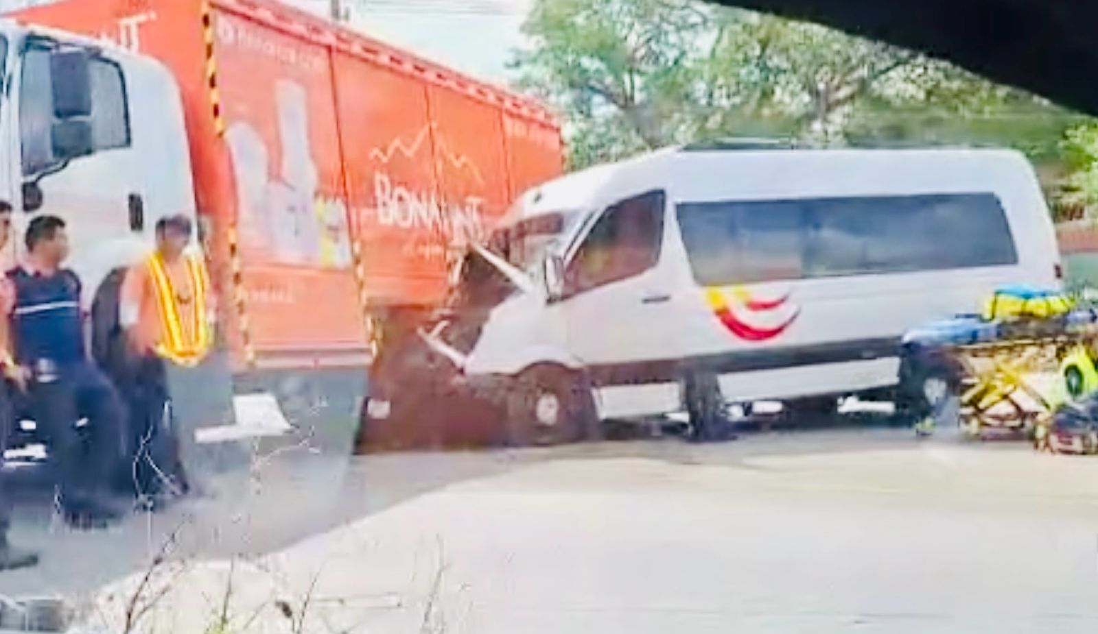 Según reportes preliminares, el camión de la empresa Bonafont intentó realizar una vuelta en “U” sin las debidas precauciones, momento en el que fue impactado en la parte trasera por una unidad de transporte turístico, que circulaba en dirección a Cancún.
