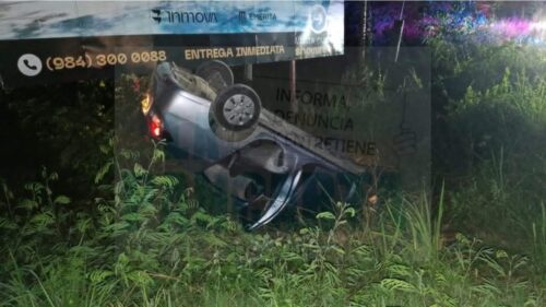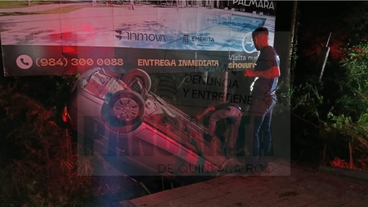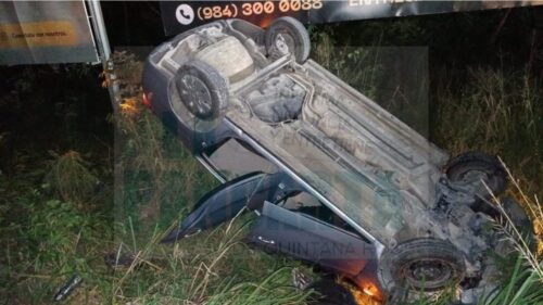 Playa del Carmen, jueves 11 de diciembre de 2025.-Una aparatosa volcadura se registró alrededor de la medianoche sobre la carretera federal, a la altura del acceso al fraccionamiento Bali, en Playa del Carmen.