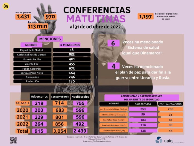 Al 31 de octubre de este 2022, suman 970 conferencias matutinas del Gobierno federal encabezado por el presidente Andrés Manuel López Obrador, informó la agencia SPIN-Taller de Comunicación Política (SPIN-TCP).