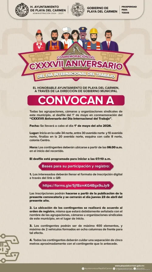 Con esta convocatoria, el Gobierno Municipal reafirma su compromiso de promover la participación ciudadana y reconocer la importancia de las y los trabajadores en el desarrollo y crecimiento de Playa del Carmen.