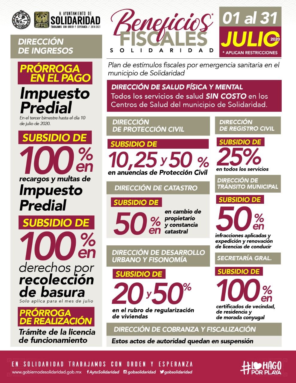 La directora de Ingresos, Mirna Mayorga Reyes, indicó que dentro de los estímulos fiscales que se seguirán dando en el mes de julio, están incluidos: el pago del predial en el que se otorga el 100% en los recargos que se tengan en los primeros bimestres de este año, 25% de descuento en todos los trámites del Registro Civil, 50% en emisión de licencias de conducir por 2 años, descuentos en usos de suelo, consultas médicas gratuitas, entre otros. Los interesados podrán consultar estos beneficios en la página oficial del ayuntamiento: www.gobiernodesolidaridad.gob.mx.
