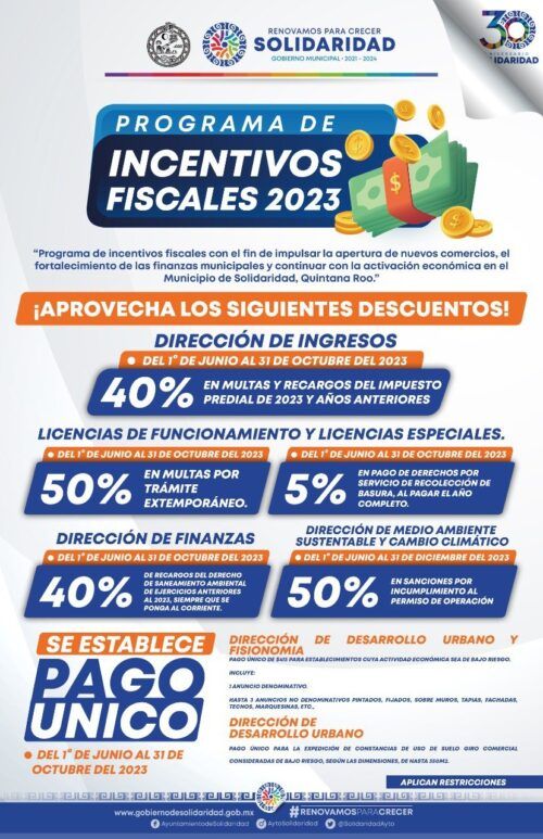 Cabe resaltar que la dirección de Desarrollo Urbano y Fisonomía establece pago único para establecimientos, cuya actividad sea de bajo riesgo, tanto en anuncios como en la expedición de constancias de uso de suelo de giro comercial. Para conocer mayores especificaciones, montos de descuentos y restricciones, se puede checar la página oficial, redes sociales o acudir directamente a las oficinas del Ayuntamiento, o si prefiere, comunicarse al (984) 877 50 30.