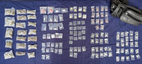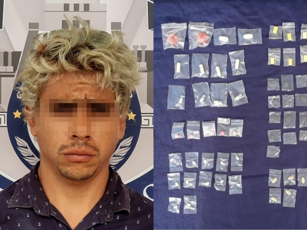 Por tal motivo bajo la sospecha de una posible comisión de delito, los policías le dieron alcance, y al realizarle una revisión de seguridad encontraron entre sus pertenencias 98 bolsas con pastillas de color amarillo con las características de la droga conocida como cocaína, 19 bolsas con vegetal verde y seco similar a la marihuana, 17 bolsas con pastillas de las características de la droga éxtasis y 2 gomas comestibles conocidas por contener la droga llamada ácido lisérgico.