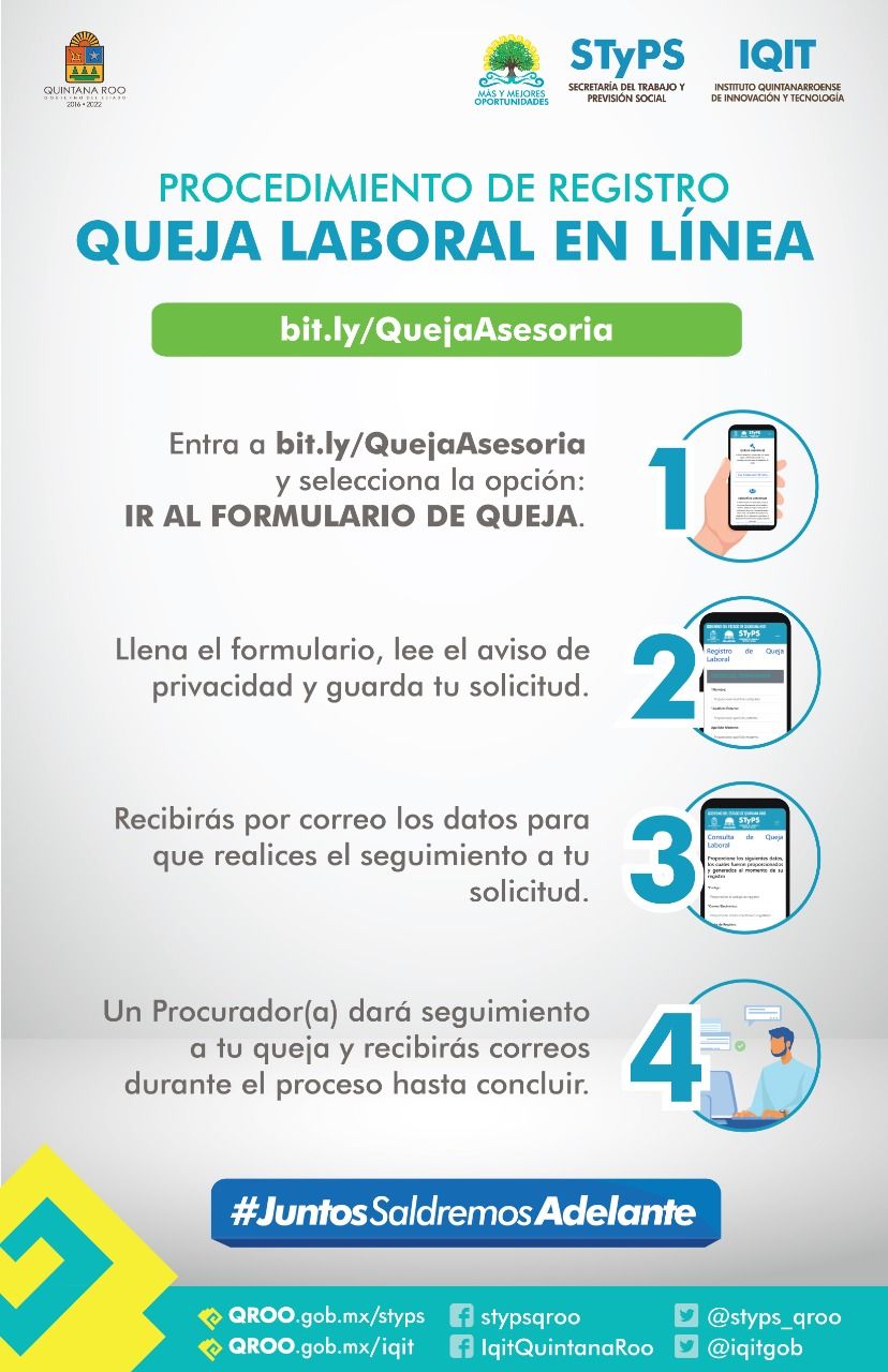 CHETUMAL, Quintana Roo, 15 de abril.- Para brindar un servicio más rápido y de principio a fin a quienes han sido despedidos injustificadamente durante la contingencia sanitaria, la Secretaría del Trabajo y Prevención Social (STyPS) pone en marcha el Procedimiento de Registro “Queja Laboral En Línea”.