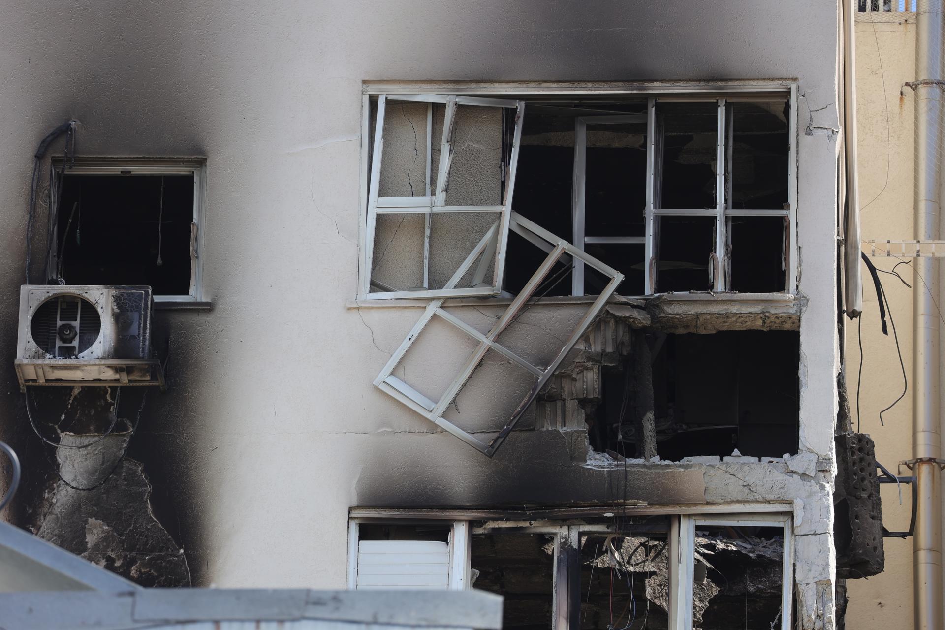 Un edificio residencial dañado en Tel Aviv tras el lanzamiento de cohetes desde Gaza, el 7 de octubre de 2023. Foto de EFE/EPA/Abir Sultan