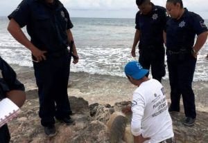 ISLA MUJERES, Quintana Roo, a 23 de Agosto.- Una tortuga blanca fue rescatada por personal de la dirección de Zona Federal Marítimo Terrestre (Zofemat), voluntarios y la policía municipal, cuando se encontraba varada, en una zona rocosa en la playa de anidación, ubicada frente al Colegio de Bachilleres de Isla Mujeres.