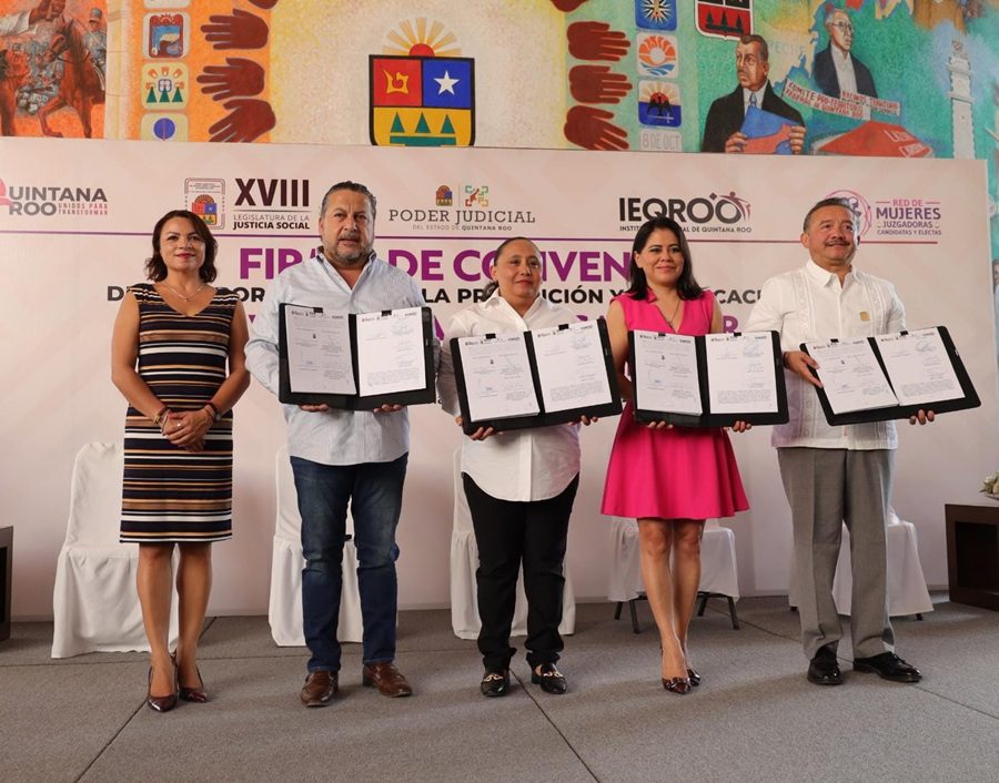 Chetumal, Q. Roo; a 28 de abril. – En el marco del Proceso Electoral Extraordinario para la elección de personas juzgadoras del Poder Judicial del Estado de Quintana Roo 2025, se llevó a cabo la firma del Convenio de Colaboración entre el Instituto Electoral de Quintana Roo y los poderes Ejecutivo, Legislativo y Judicial este convenio tiene por objetivo desarrollar actividades de información, asesoramiento, capacitación, identificación y seguimiento de casos de Violencia Política contra la Mujer en Razón de Género.