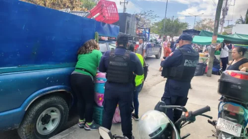 Minutos después arribaron elementos de la Secretaría Municipal de Seguridad Pública; sin embargo, debido a la gran cantidad de puestos y personas en el tianguis, los agentes tuvieron que avanzar a pie entre los pasillos del mercado para llegar hasta el sitio.