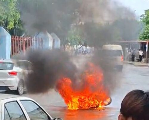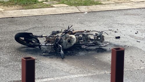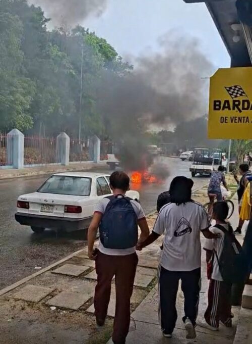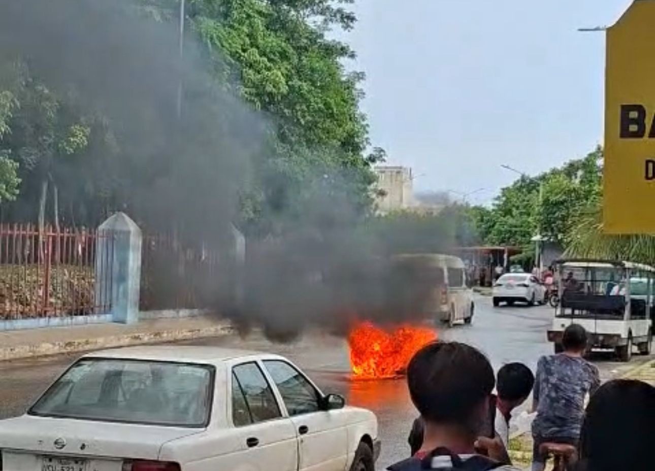PLAYA DEL CARMEN, Quintana Roo, 09 de octubre de 2025.— Un hombre y su hija resultaron con quemaduras luego de que la motocicleta en la que viajaban se incendiara súbitamente frente al Quinto Parque del fraccionamiento Villas del Sol, en Playa del Carmen.