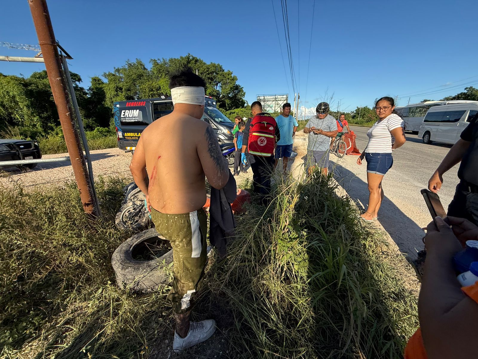 Huye conductor tras impactar a motociclista en la carretera federal 307; paramédicos lo trasladan al hospital