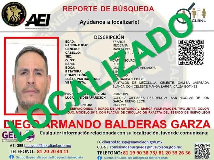 Se trata de Diego Armando Balderas Garza, de 37 años, quien contaba con un reporte de desaparición.