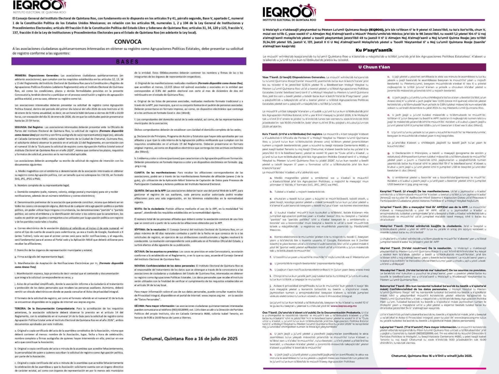 CHETUMAL, Quintana Roo, 18 de agosto.– El Instituto Electoral de Quintana Roo (IEQROO_oficial) anunció la apertura del periodo para que asociaciones ciudadanas interesadas obtengan su registro como Agrupaciones Políticas Estatales (APEs).