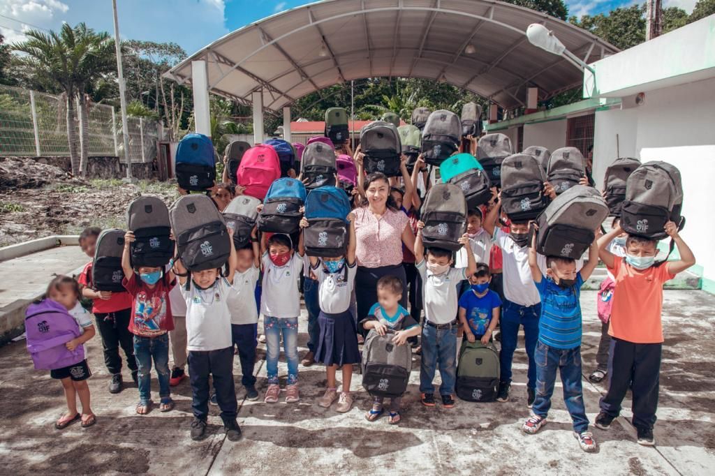Ileana Canul entrega mochilas y útiles escolares a estudiantes de la zona maya.