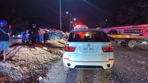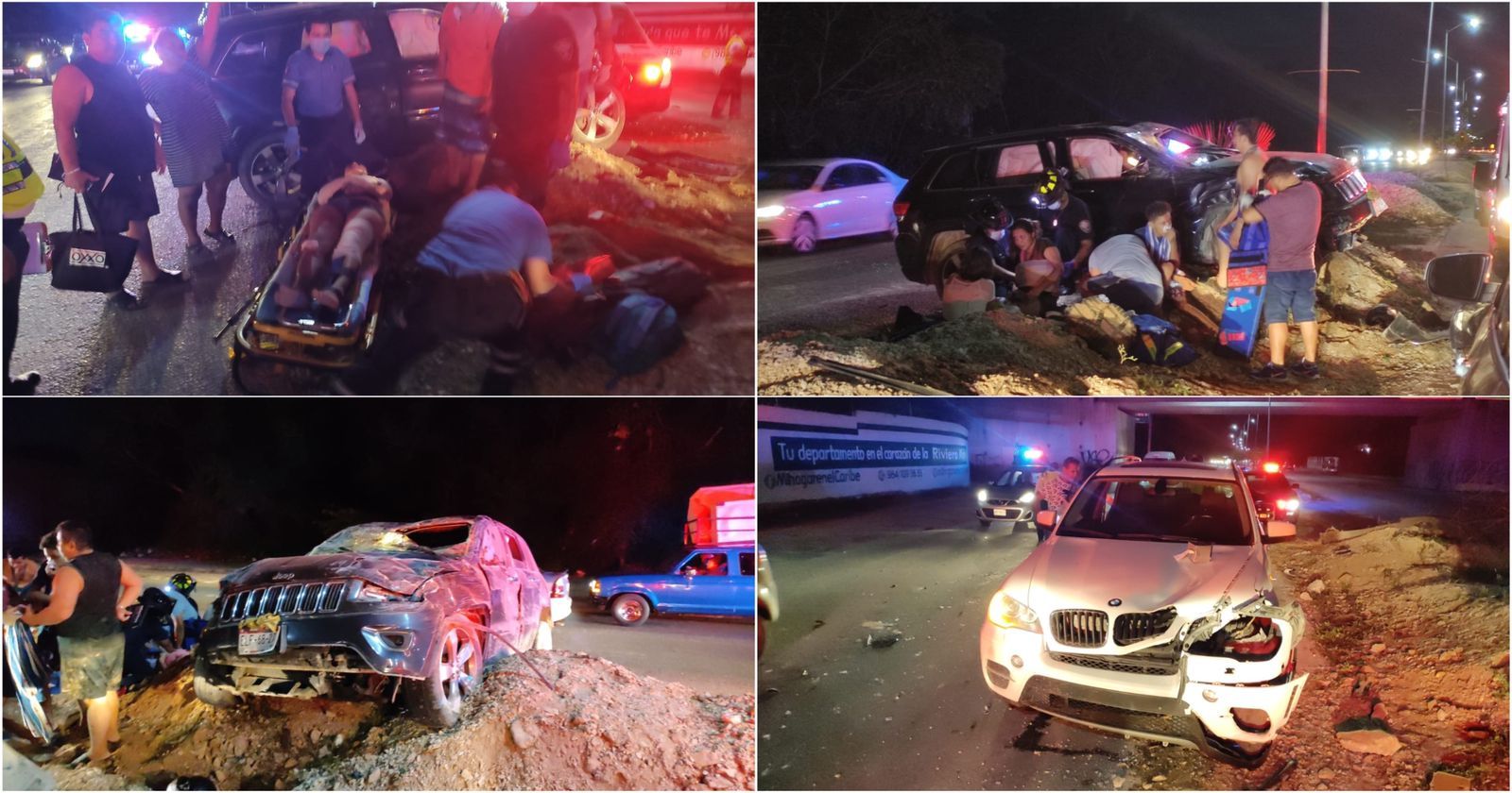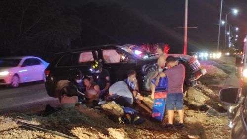 PLAYA DEL CARMEN, Quintana Roo, 02 de enero.- Fuerte accidente se registro sobre la autopista el Tintal en la noche, luego de que imprudente conductor de un vehículo particular realizará una vuelta en un lugar prohibido, impactando una camioneta donde viajaba una familia de turistas nacionales.