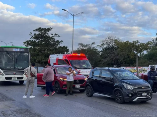 PLAYA DEL CARMEN, Quintana Roo, 24 de febrero de 2026.— Conducir por encima del límite de velocidad provocó un accidente múltiple la mañana de este lunes en el fraccionamiento Santa Fe, luego de que el operador de un autobús de la empresa Selva Maya colisionara por alcance a dos vehículos que se habían detenido ante un paso peatonal.