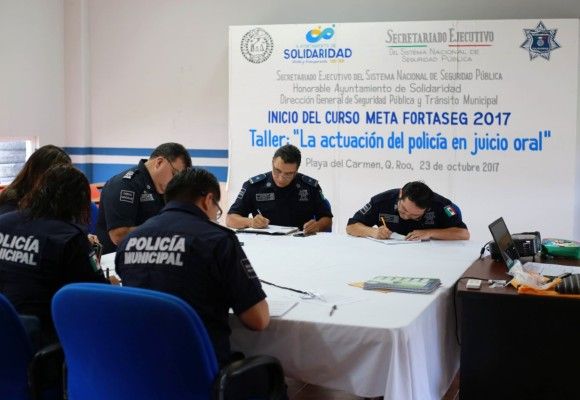 PLAYA DEL CARMEN, Quintana Roo, 23 de octubre.- Altos mandos de la Dirección General de Seguridad Pública y Tránsito del Gobierno de Solidaridad, están siendo capacitados sobre “La actuación del policía en el juicio oral” con la finalidad de dar cumplimiento a los indicadores del Plan Municipal de Desarrollo (PMD) 2016-2018: Mejorar la profesionalización continua de los elementos de seguridad y Capacitar al cien por ciento al personal en Sistema de Justicia Penal Acusatorio.