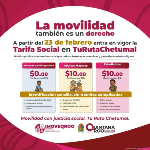 Chetumal, 23 de febrero de 2026.- El Instituto de Movilidad del Estado de Quintana Roo (IMOVEQROO) inició este lunes con la implementación de la Tarifa Social en el sistema de transporte urbano de “Tu Ruta Chetumal”, anunciado previamente por la gobernadora Mara Lezama Espinosa, bajo la visión y el compromiso de un gobierno humanista y con justicia social para todas y todos los quintanarroenses.