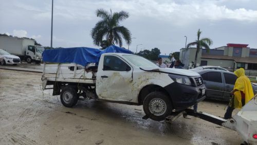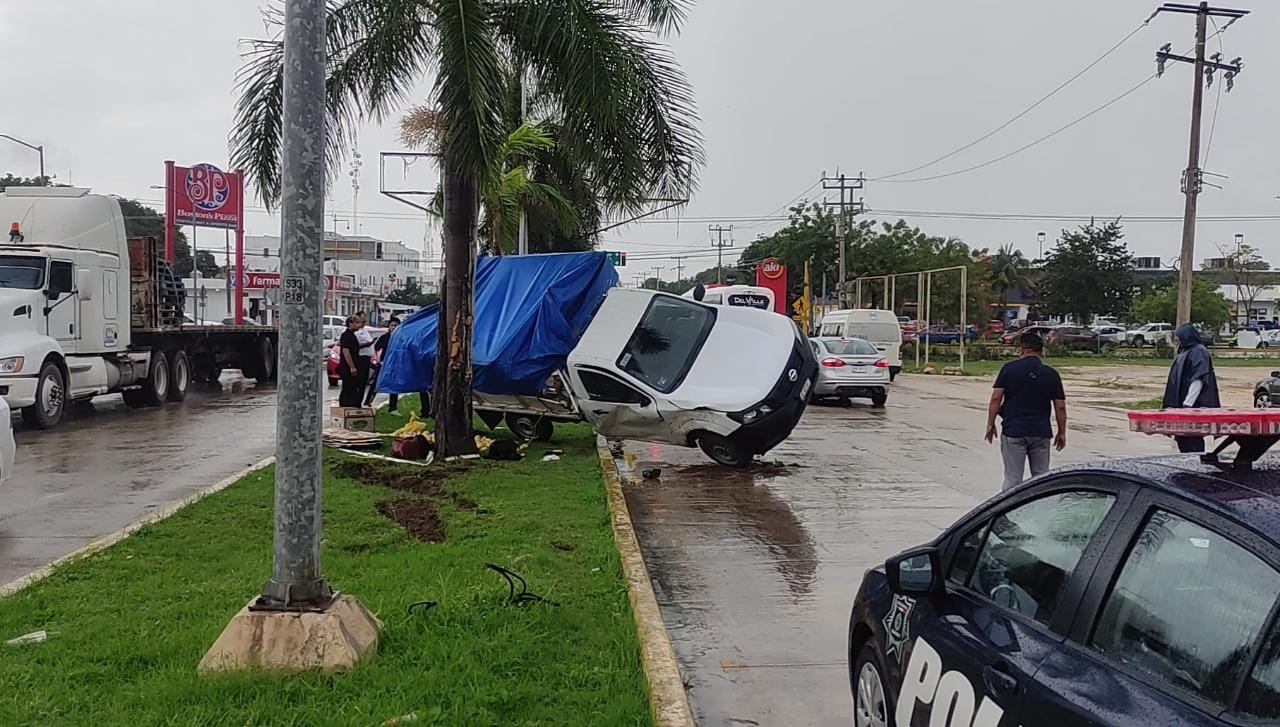 PLAYA DEL CARMEN, Quintana Roo, 21 de noviembre. –  Conductor de una camioneta particular en la que transportaba frutas, volcó debido al pavimento mojado luego de que derrapara la unidad.