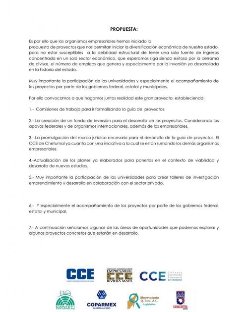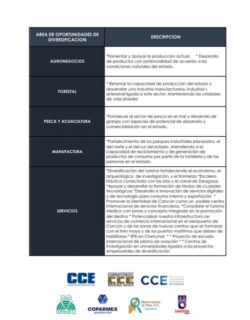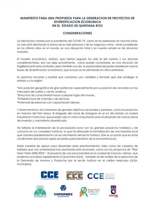 PLAYA DEL CARMEN, Quintana Roo, 17 de junio.-Los Consejos Coordinadores Empresariales de la Riviera Maya, del Caribe, y de Chetumal, Canacintra Cancún, Coparmex Quintana Roo, Observatorio Legislativo de Quintana Roo, y CANIETI presentaron una propuesta para la Generación de Proyectos de Diversificación Económica en el Estado de Quintana Roo en el que se impulsen las áreas de oportunidades como: los agro negocios, forestal, manufactura, servicio, pesca y acuacultura en el participe el sector empresarial, universidades, y los tres órdenes de Gobierno.