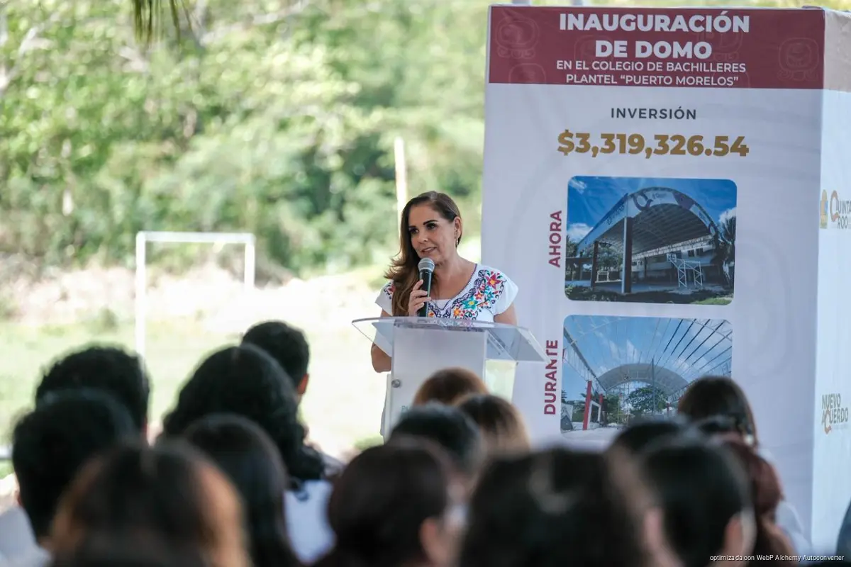Puerto Morelos, 6 de marzo de 2026.- La gobernadora Mara Lezama Espinosa cumplió una promesa al inaugurar un domo ligero en el Colegio de Bachilleres de Puerto Morelos, obra destinada a mejorar las condiciones para las actividades deportivas, culturales y cívicas de 421 estudiantes de esta institución.