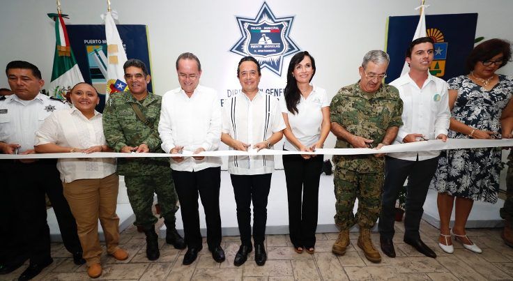 Acompañado por la presidenta municipal de Puerto Morelos, Laura Fernández Piña, el secretario de Gobierno, Francisco López Mena, el secretario de Seguridad Pública en Quintana Roo, Rodolfo del Ángel Campos, representantes del Ejército Mexicano y Armada de México, el Gobernador Carlos Joaquín cortó el listón inaugural del nuevo y moderno edificio.