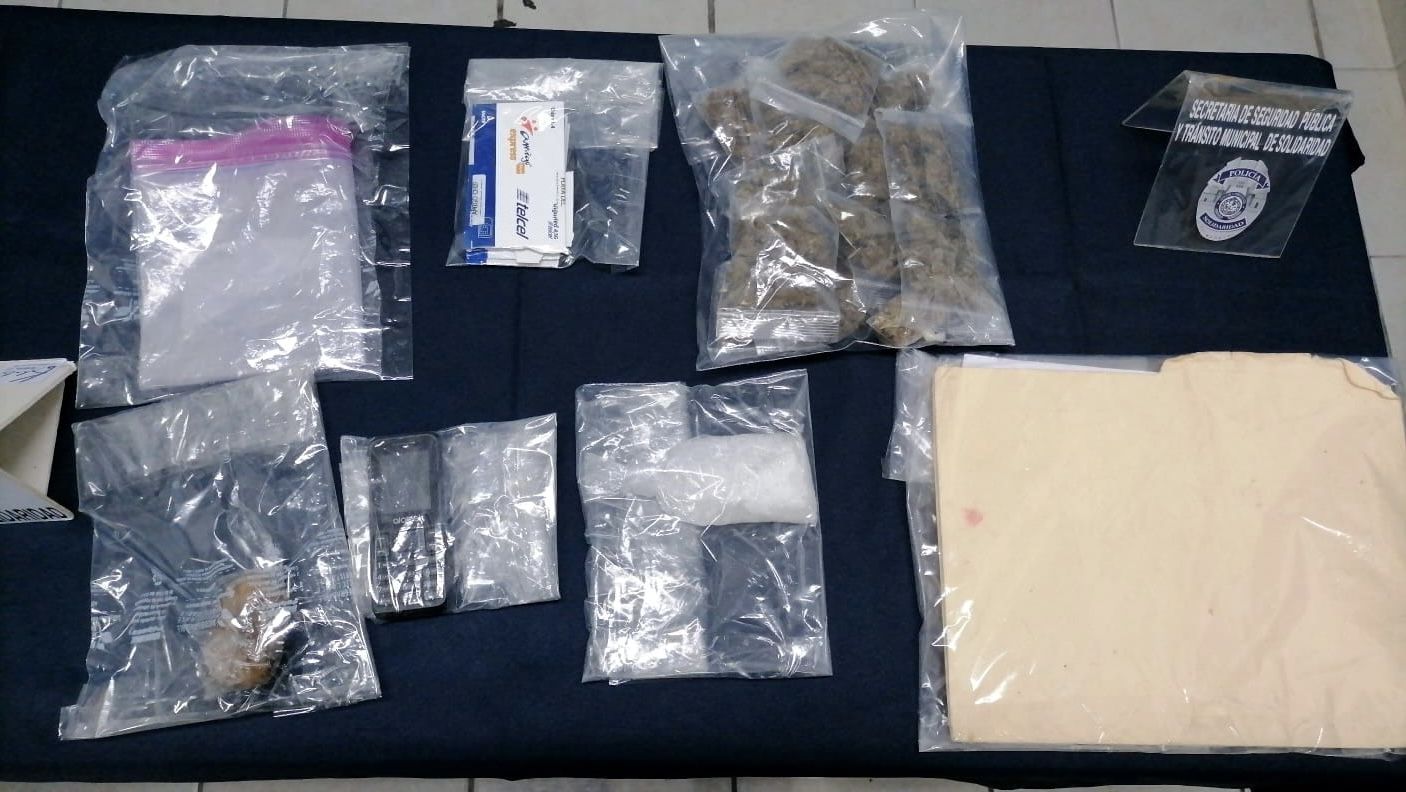 Al interior se aseguraron 14 envoltorios con lo que parece ser marihuana, un envoltorio con la posible droga cristal y un envoltorio con una sustancia a determinar.