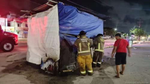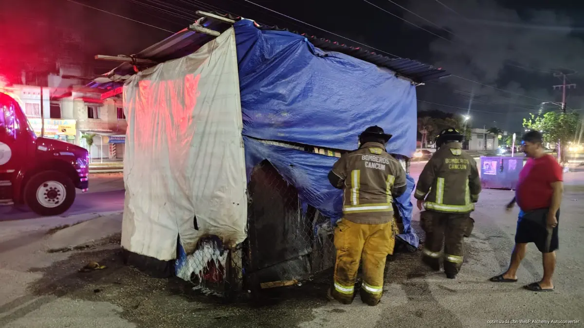 CANCÚN, Quintana Roo, 12 de abril de 2026.- Un incendio provocado se registró la madrugada de este sábado en un puesto de venta de frutas y verduras en el fraccionamiento Villas Otoch Paraíso, luego de que presuntos delincuentes rociaran thinner y le prendieran fuego.
