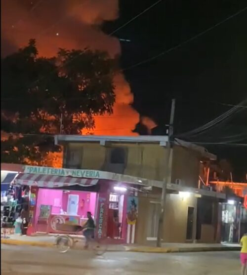 TULUM, Quintana Roo, 18 de noviembre de 2025.— La noche de este lunes se registró un incendio en un predio ubicado frente a la iglesia de la Cancha Maya, el cual dejó como saldo dos palapas consumidas por el fuego y daños materiales en objetos almacenados.