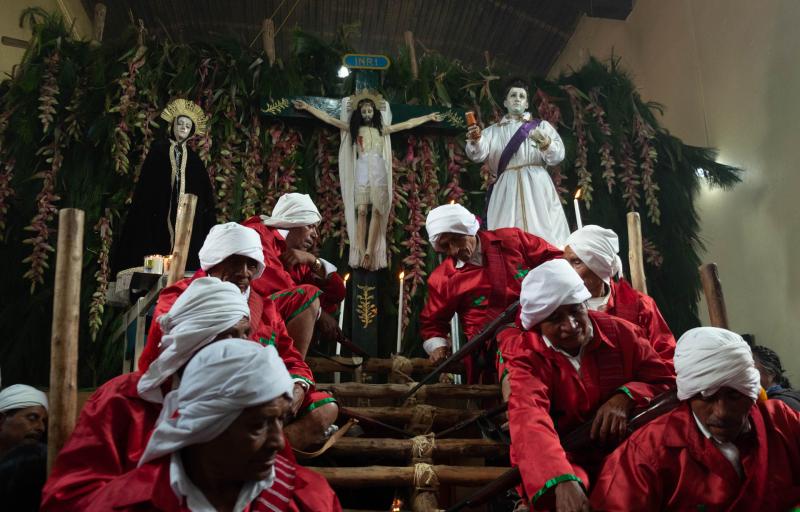 Las imágenes de la Virgen de la Soledad, San Juan y el Cristo Crucificado fueron veneradas con largas horas de rezos, coronas de palma con manzanilla para pedir por la humanidad, por la salud y para erradicar la violencia entre sus pueblos indígenas.