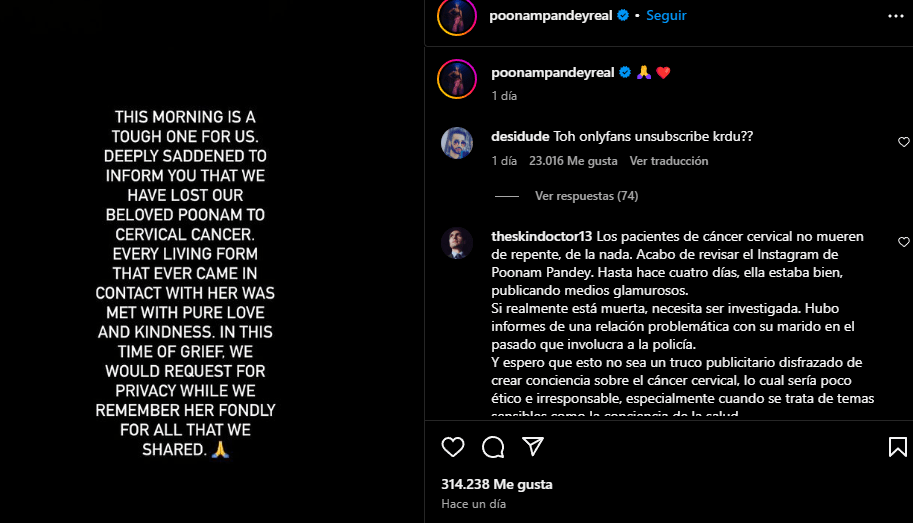 “Los pacientes de cáncer cervical no mueren de repente. Acabo de revisar el Instagram de Poonam Pandey. Hasta hace cuatro días estaba bien. Si realmente está muerta, necesitan investigar. Hubo informes de una relación problemática con su marido en el pasado. Y espero que esto no sea un truco publicitario disfrazado de crear conciencia sobre el cáncer cervical, lo cual sería poco ético e irresponsable”, comentó un usuario en la publicación.