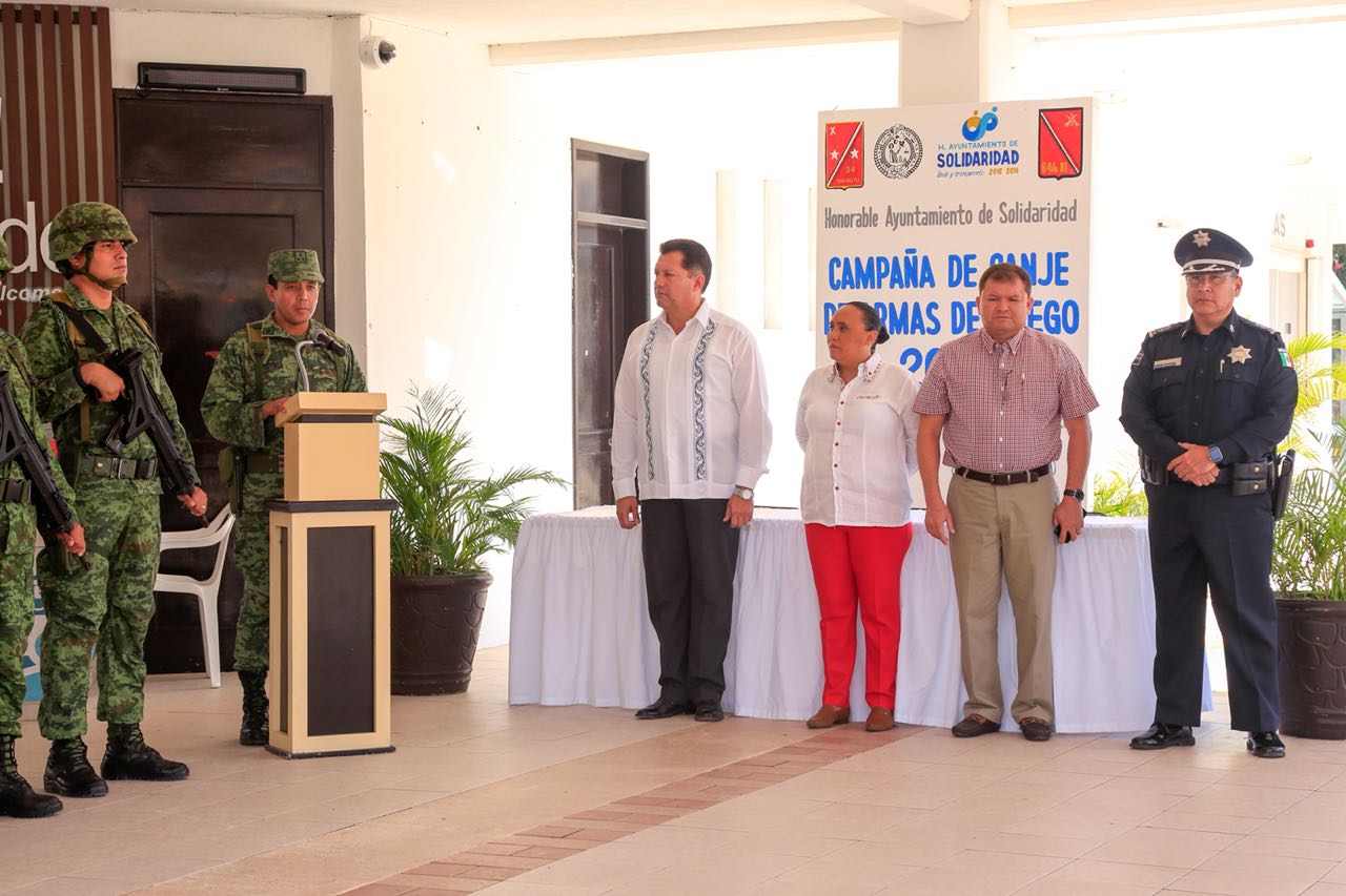 PLAYA DEL CARMEN, Quintana Roo, 30 de agosto.- La Presidenta Municipal de Solidaridad, Cristina Torres Gómez, y el Coronel de Infantería DEM, Juan José Montiel Maldonado, dieron inicio al programa de “Canje de armas” en el acceso principal del Palacio Municipal, con la finalidad de reducir la posesión de armamento de cualquier tipo mediante la entrega voluntaria de armas y municiones a cambio de incentivos económicos.
