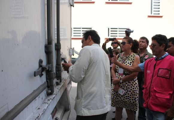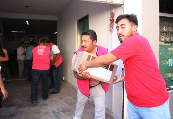 PLAYA DEL CARMEN, Quintana Roo, 5 de junio.- Minutos después de las tres de la tarde arribó a la sede de la Junta Distrital 01 el camión con los paquetes electorales que contienen las boletas, actas y documentación con membrete, custodiado por elementos de la Secretaría de Marina-Armada de México.