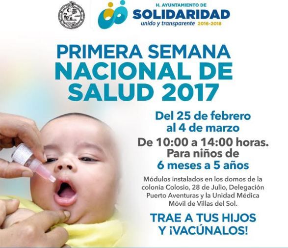 PLAYA DEL CARMEN, Quintana Roo, 25 de Febrero.- El Gobierno de Solidaridad encabezado por la Presidenta Municipal, Cristina Torres Gómez, informó que este sábado inicia la Primera Semana Nacional de Salud “Mientras tú los cuides, las vacunas los protegen”, que tiene como objetivo reforzar el cuadro de vacunación infantil anual.