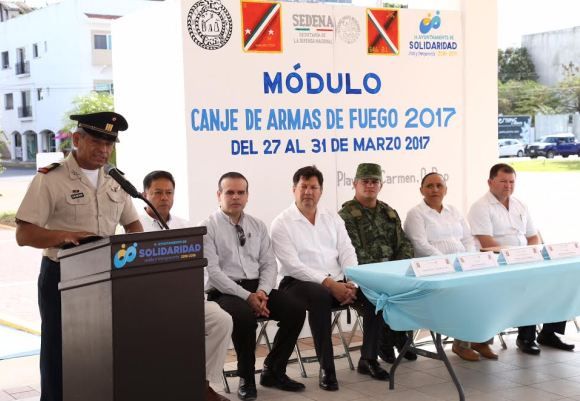 PLAYA DEL CARMEN, Quintana Roo, 27 de marzo.- El Gobierno de Solidaridad en coordinación de la Secretaría de la Defensa Nacional (SEDENA), puso en marcha el programa de “Canje de Armas de Fuego 2017”, en busca de recolectar estos artículos de manera voluntaria, anónima y pacífica, reduciendo la posesión ilegal e incrementando la seguridad entre la población.