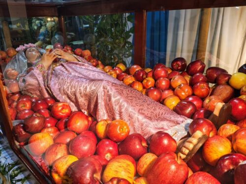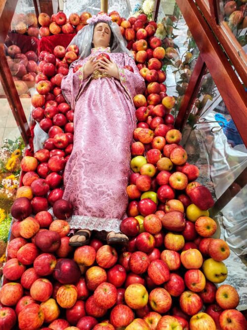En el altar de la Virgen de la Dormición se ha colocado una urna que representa a María en su lecho de muerte, rodeada de manzanas. Este fruto tiene una profunda carga simbólica: representa la victoria de María sobre el pecado y la muerte, y es una referencia a la creencia de que la habitación donde descansaba la Virgen se llenó de un dulce y celestial aroma, semejante al de las manzanas. También alude a la figura de María como la “Nueva Eva”, quien, a diferencia de la primera mujer según la tradición bíblica, no sucumbió al pecado original.
