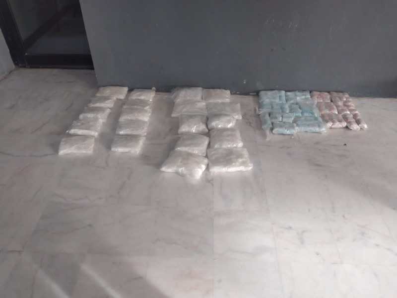 Agentes investigadores se presentaron a la colonia Lucero, donde después de un revisión localizaron 35 paquetes de fentanilo en colores, 50 paquetes en color azul de fentanilo, así como 10 bolsas medianas de cristal de aproximadamente medio kilogramo.