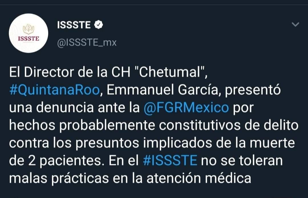 La publicación fue la siguiente: “El Director de la CH «Chetumal», #QuintanaRoo, Emmanuel García, presentó una denuncia ante la @FGRMexico por hechos probablemente constitutivos de delito contra los presuntos implicados de la muerte de 2 pacientes. En el #ISSSTE no se toleran malas prácticas en la atención médica”.