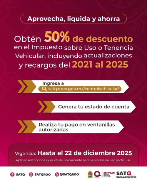 La Gobernadora detalló que las y los contribuyentes pueden acceder a este beneficio acudiendo directamente al Servicio de Administración Tributaria de Quintana Roo (SATQ) ingresando a la página oficial o comunicándose a los teléfonos disponibles para recibir orientación sobre el trámite.