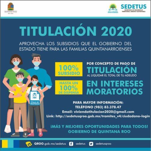 Como una medida de prevención y control contra el Covid-19 y para garantizar la atención, proteger la salud de los servidores públicos y ciudadanía en general, los interesados pueden comunicarse al número telefónico 983-83-378-47 o, a través del correo electrónico viviendatitulacion2020@gmail.com; o si lo desean, pueden ingresar a la página Web: sedetusqroo.gob.mx/tramites_v4/ciudadano-login , donde recibirán atención e información necesaria que les permita obtener los beneficios del programa.