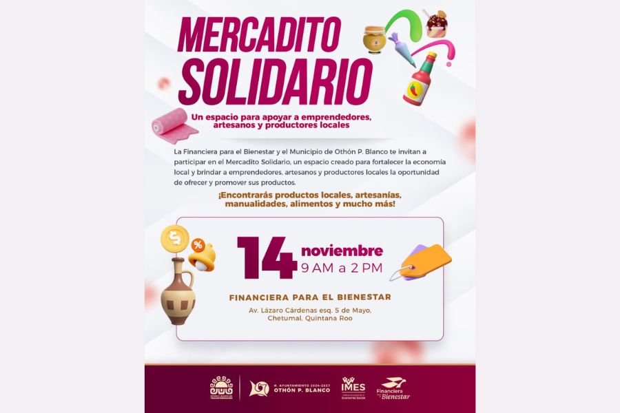 El “Mercadito Solidario” tendrá lugar el viernes 14 de noviembre, de 9 de la mañana a 2 de la tarde, en las instalaciones de la Financiera para el Bienestar, ubicada en la avenida Lázaro Cárdenas con esquina 5 de Mayo.