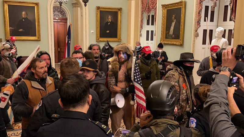 La primera escena del asalto que dio la vuelta al mundo tuvo a Chansley de protagonista, con el puño en alto, como “presidente” momentáneo del Senado de Estados Unidos, en medio del caos desatado.