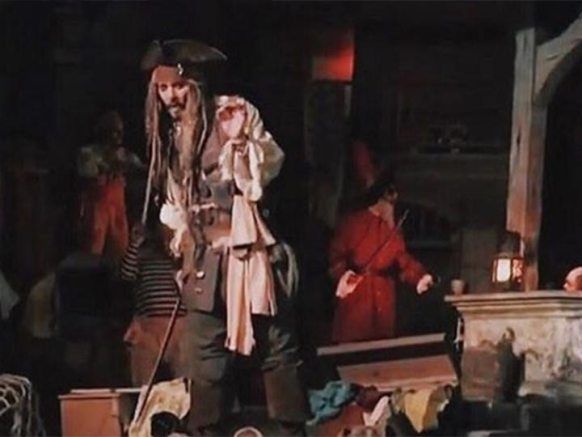 La estrella de 53 años aparece agitando su espada y hablando con los visitantes con el típico acento británico que imita su personaje. En tono de broma, el intérprete les dijo a los que se encontraban en la embarcación que saltaran al agua para que él pudiera subirse al barco. Pero su petición no surtió efecto, aunque provocó muchas risas nerviosas.