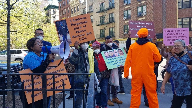 Un grupo de manifestantes hondureños sostiene pancartas y grita consignas contra el expresidente hondureño Juan Orlando Hernández, acusado de narcotráfico, durante una protesta hoy martes, en la puerta de un tribunal federal en Nueva York. EFE/Jorge Fuentelsaz