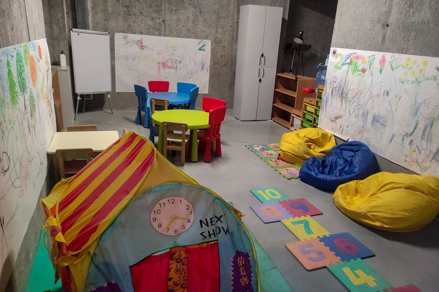 KIEV, 21/05/2023.- Vista de la zona para niños dentro del refugio antiaéreo habilitado en un aparcamiento subterráneo de Kiev. Las autoridades trabajan para asegurarse de que todos los refugios de Kiev preparados para cobijar a los vecinos durante las alertas antiaéreas tras intensificar Rusia el calibre y la frecuencia de sus bombardeos. EFE/Marcel Gascón