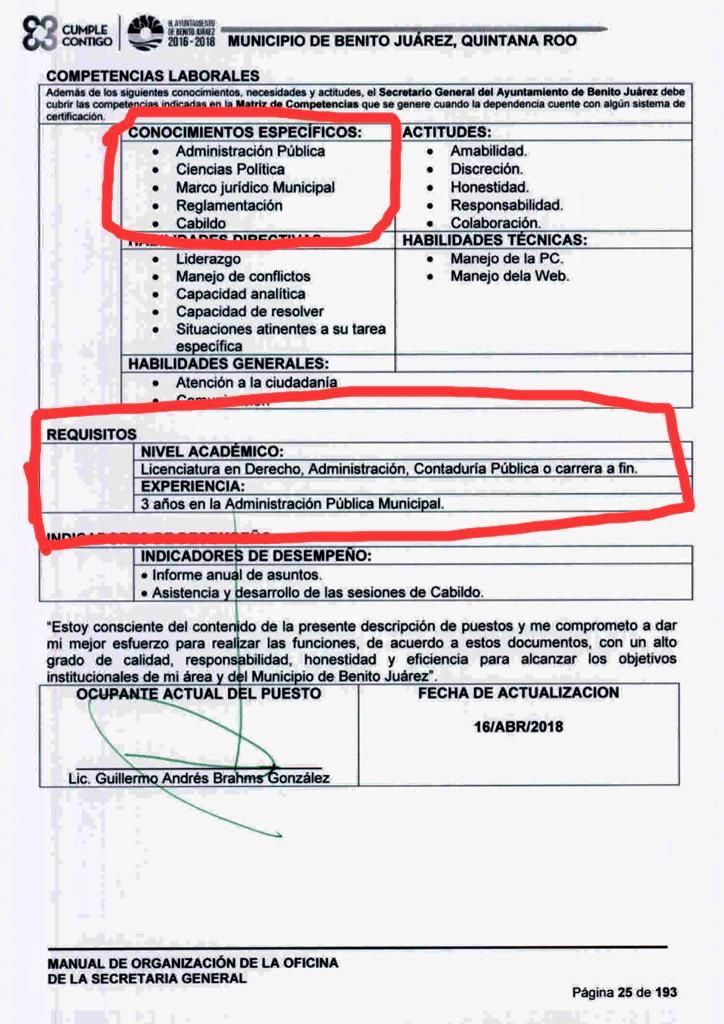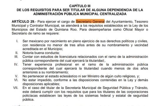 BENITO JUÁREZ, Quintana Roo, 19 de junio de 2020.- Victor Hugo Vargas. Se tambalea la propuesta de la presidenta municipal de Benito Juárez, Mara Lezama Espinoza para que Issac Janix Alanís sea el próximo Secretario General de Ayuntamiento, esto por no cumplir con los requisitos que solicita el Reglamento Interno Municipal. Además de violar el artículo 168 de la Constitución Política del Estado de Quintana Roo, la Ley de los Municipios y el artículo 29 de la Administración Pública Descentralizada.