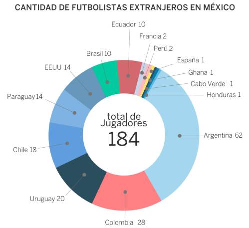 Las nacionalidades preferidas por los clubes de la liga mx son la argentina con 62 jugadores, la colombiana (28), la uruguaya (20) y la chilena (18). También juegan tres europeos: el español Abraham González de Pumas, además de los franceses André-Pierre Gignac y Andy Delort.