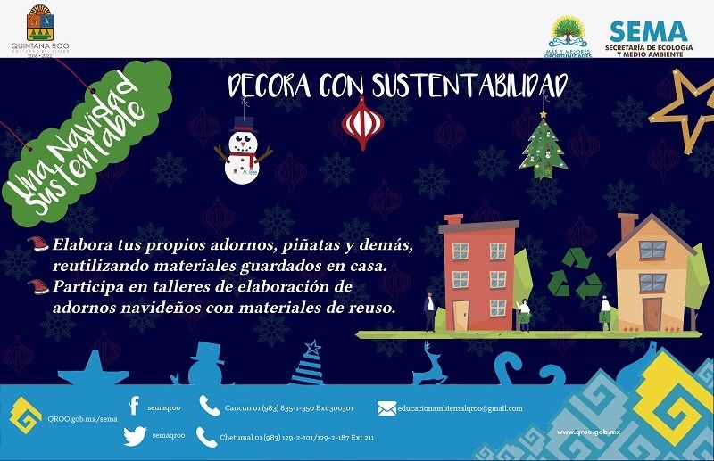 CHETUMAL, Quintana Roo, 28 de noviembre.- La Secretaría de Ecología y medio Ambiente promueve una Navidad sustentable mediante una estrategia de comunicación y educación ambiental que fomenta el consumo responsable y reutilización de materiales del hogar y oficinas informó al respecto el secretario de Ecología y Medio Ambiente Alfredo Arellano Guillermo.