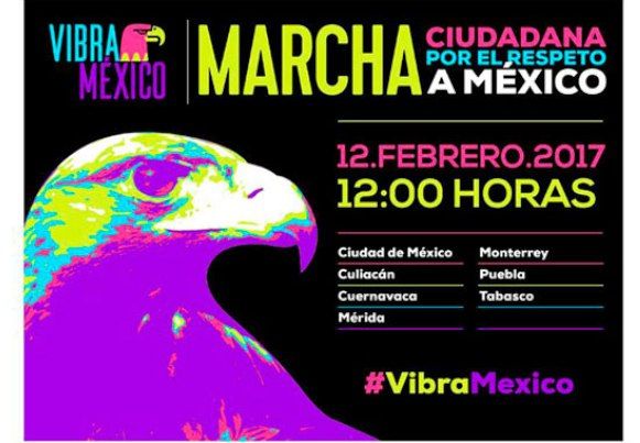 CIUDAD DE MÉXICO, 9 de Febrero.- La sociedad civil mexicana ha dicho basta. El país más acosado desde que Donald Trump llegó a la Casa Blanca y se reafirmó en su promesa electoral de construir un muro con México, ha tardado 20 días en romper su silencio, pero lo quiere hacer con fuerza. Al igual que en otras partes del mundo, sobre todo en Estados Unidos, y bajo el #VibraMéxico, 77 organizaciones civiles, académicas, empresariales e importantes personalidades de la cultura marcharán este domingo, 12 de febrero, en la capital y en otras seis ciudades del país (Culiacán, Cuernavaca, Mérida, Monterrey, Puebla e Irapuato) en defensa de la dignidad, la unidad y la soberanía del pueblo mexicano frente a las afrentas del inquilino de la Casa Blanca y para pedir el fin de la impunidad y de la corrupción.
