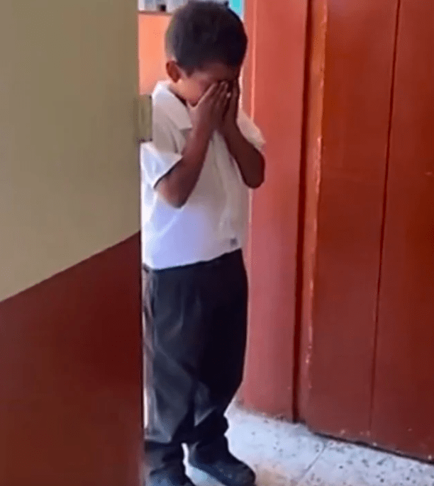 Evidentemente el pequeñito se ve feliz, pero segundos después no se puede aguantar las ganas de llorar por la emoción y se pone las manos en la cara. Sus compañeritos, así como su maestra, se acercan a él y entre todos lo abrazan para consolarlo.